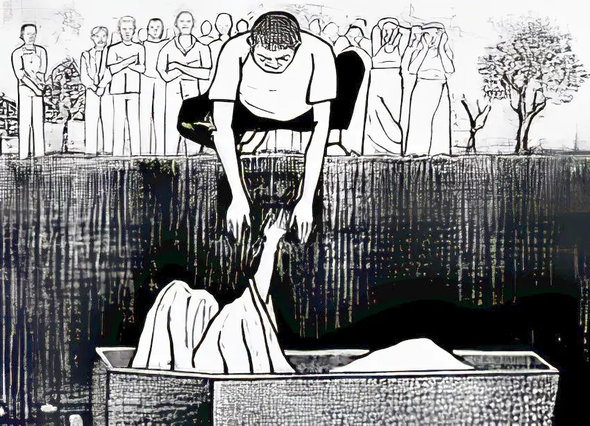 Emocjonalnie poruszony Jezus przyszedł do grobu. Grobowce często wykuwano w wapieniu, tworząc jaskinię w ścianie skalnej. Wejście do grobu było zamknięte potężnym kamieniem, który był ustawiony jakby w wykutym w skale torowisku ułatwiającym zamkniecie grobowca. Jezus nakazał, by „kamienne drzwi” zostały odsunięte z wejścia do grobowca. Scena była bardzo dramatyczna. Tłum obserwował i słuchał. Maria płakała, a Marta sprzeciwiała się, bo po czterech dniach ciało zaczęło się rozkładać.