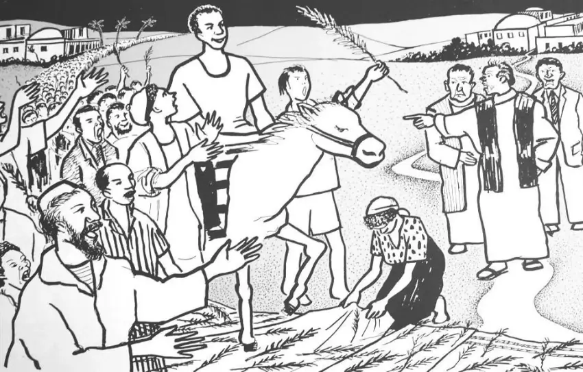 Uczniowie przygotowali osła, okryli go szatami, a ludzie rozkładali płaszcze i gałęzie na drodze. Jezus przybył skromnie, jadąc na osiołku.